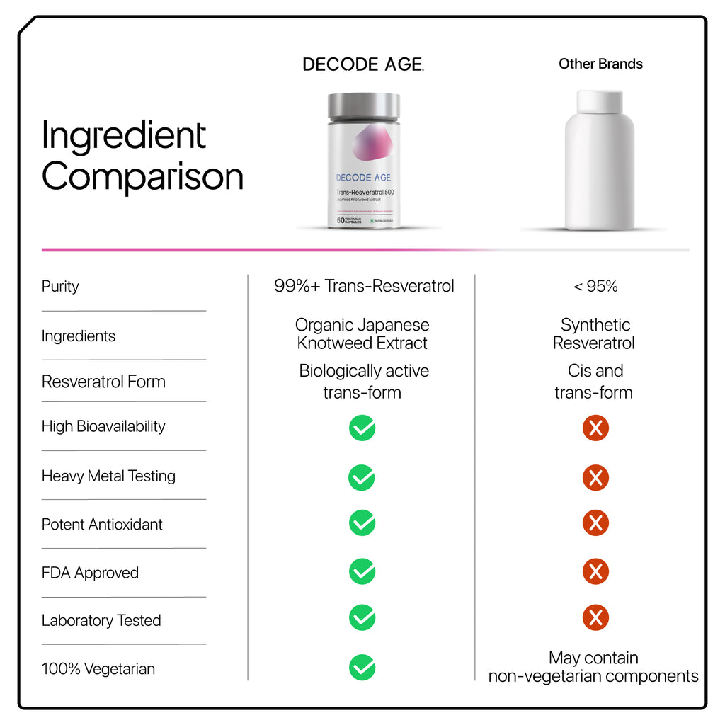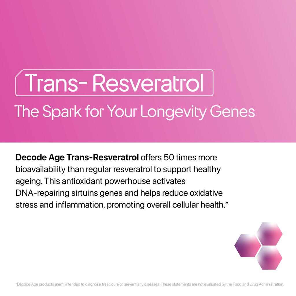 - Healthy Aging Support: Decode Age Trans Resveratrol promotes healthy aging at the cellular level, helping you look and feel your best as you navigate through life.